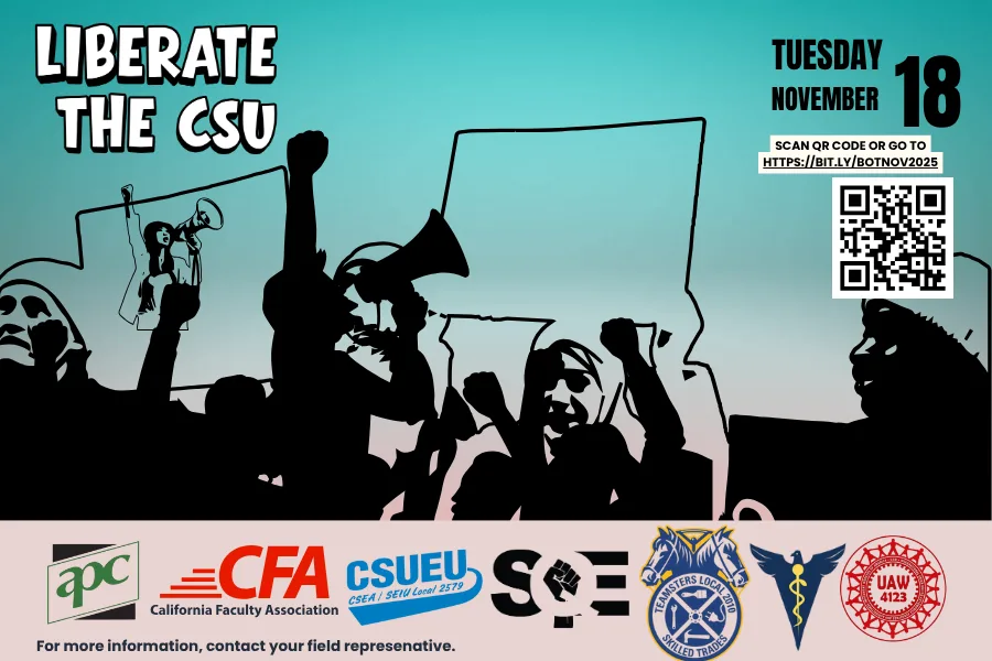Join your fellow CFA members next week for our rally on November 18 at the CSU Board of Trustees (BOT) Long Beach meeting. Let CSU trustees know that their behavior prioritizing CSU executives over faculty and students cannot continue: register to attend here and register for public comment here (virtual comment available)! .
