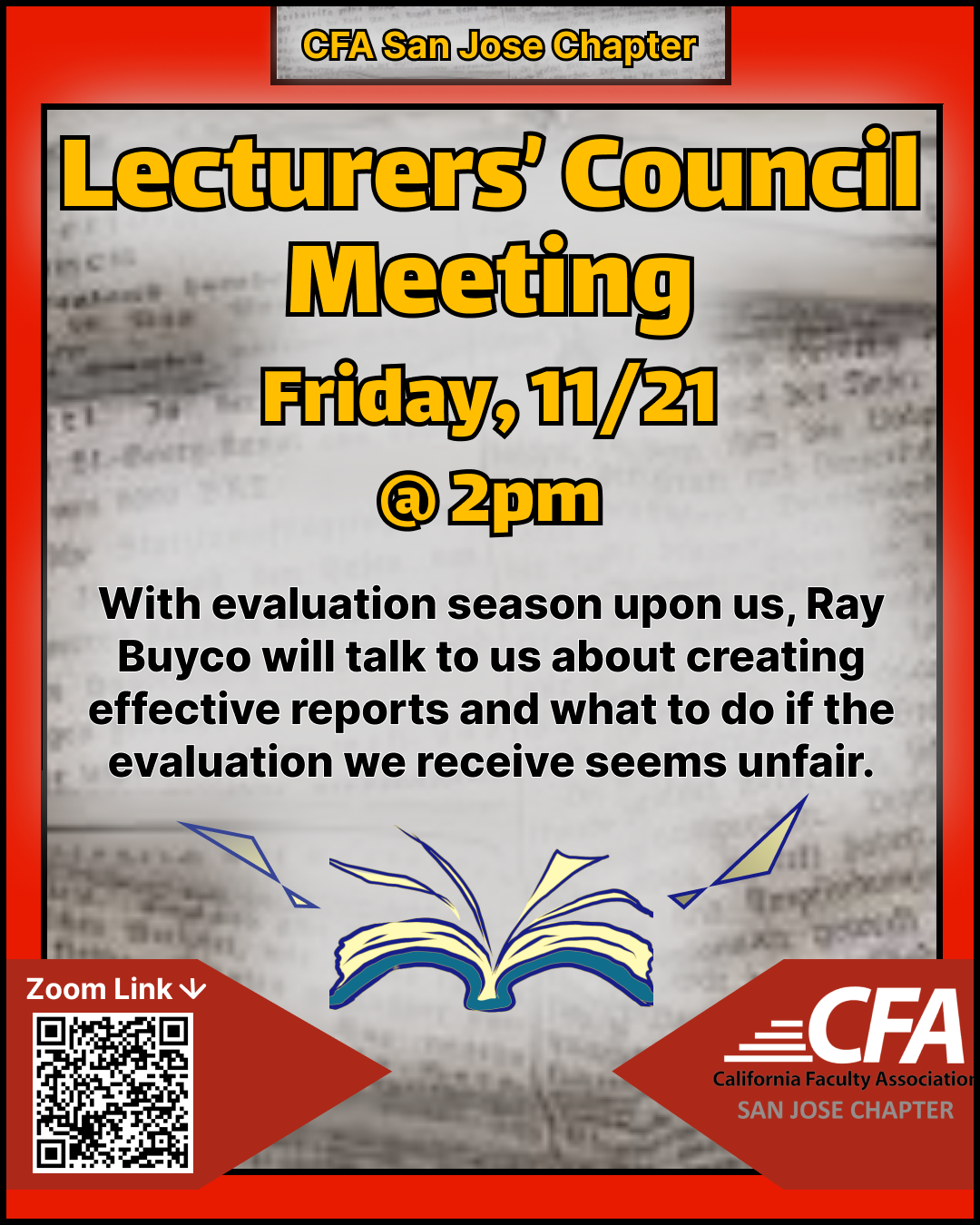 - 3/24 CFA-SJSU Newsletter for March 24, 2025: Lecturers Council Meeting Thursday, March 27: “Is My Job in Danger?”