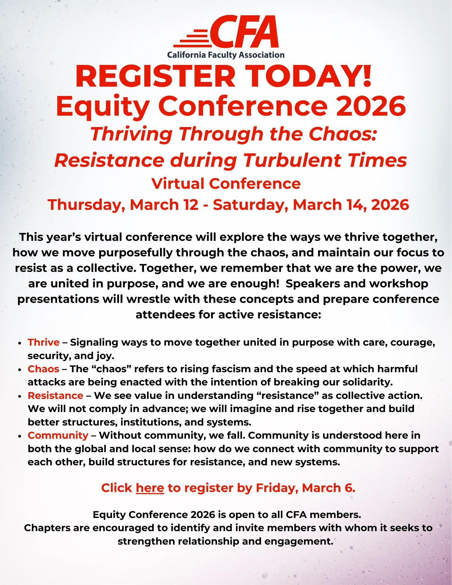Mark your calendars to save the dates. The registration is coming soon. In the meantime, Please contact your CFA Chapter Council for Racial and Social Justice Representative and Field Staff so that they can make sure you receive the registration link when it is available.