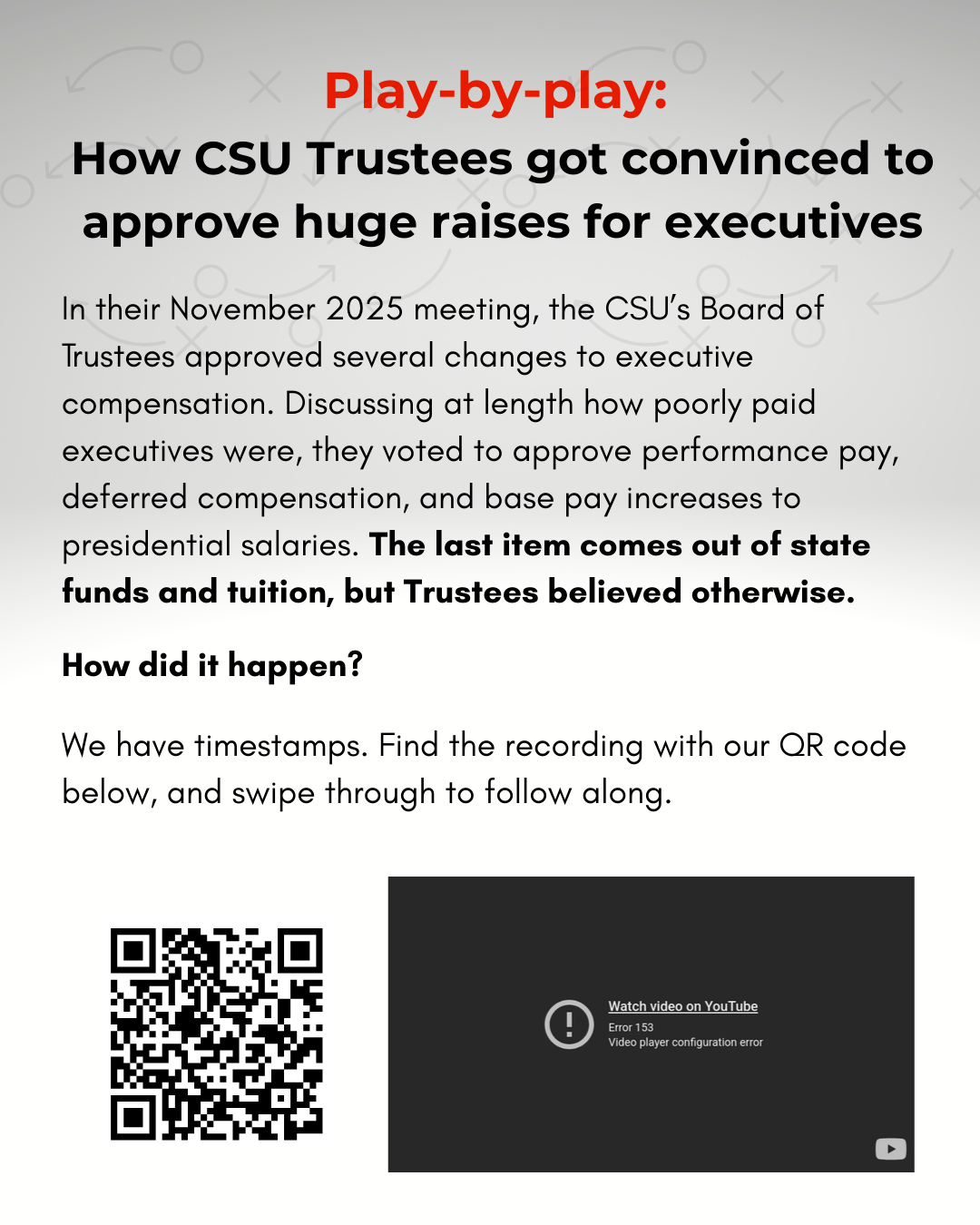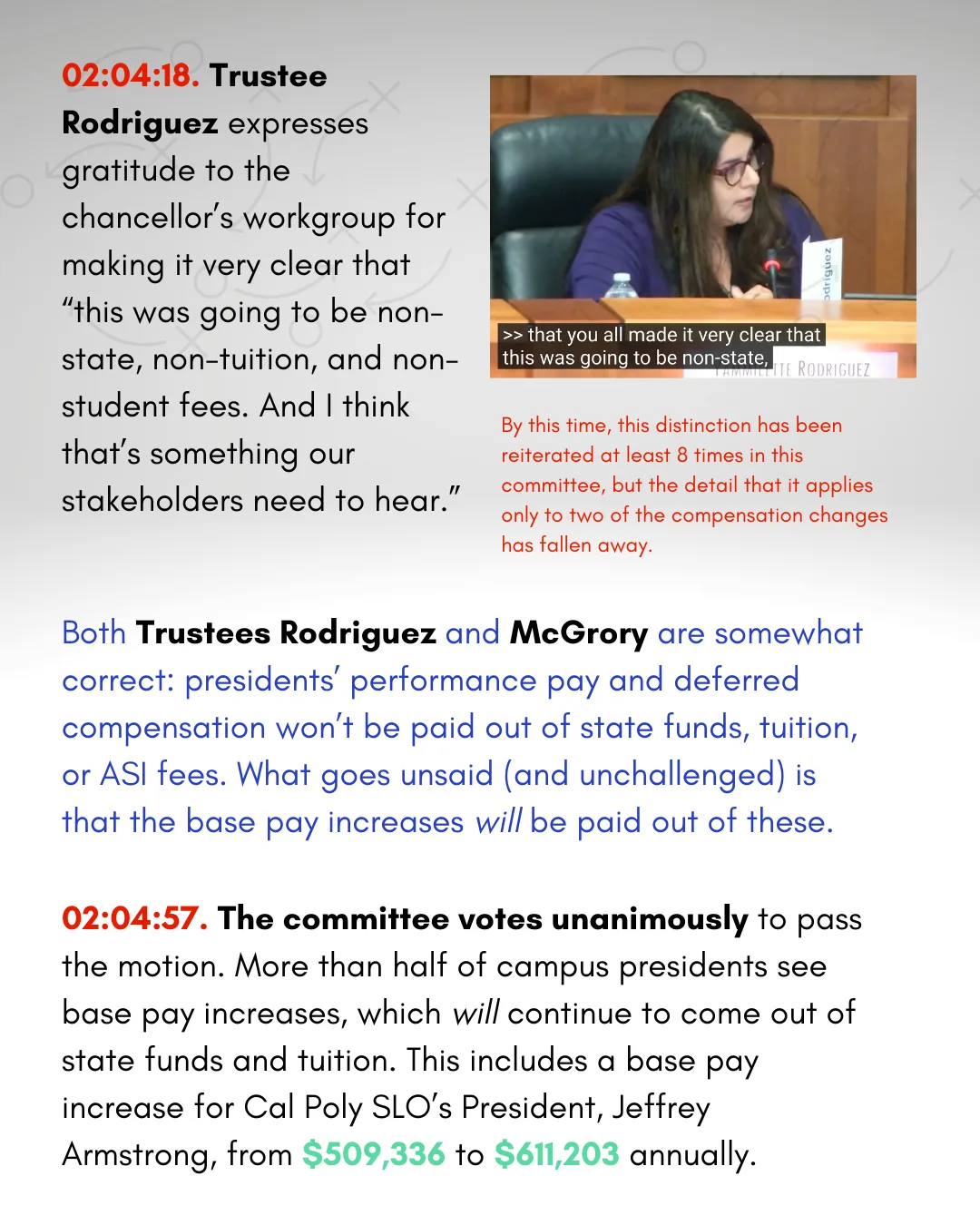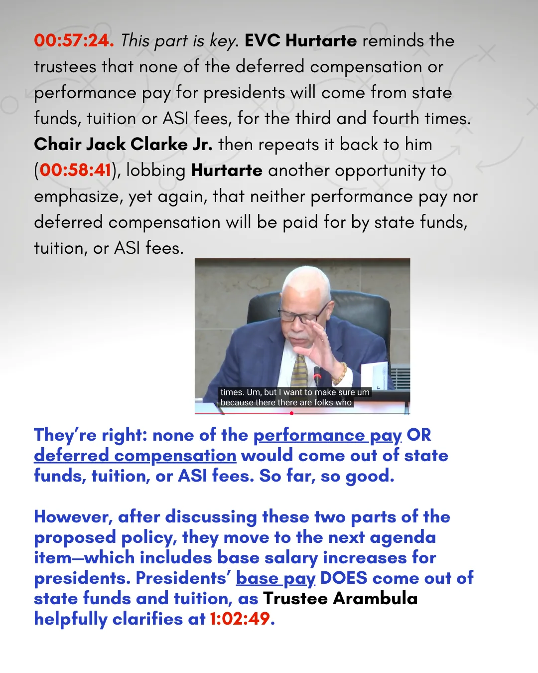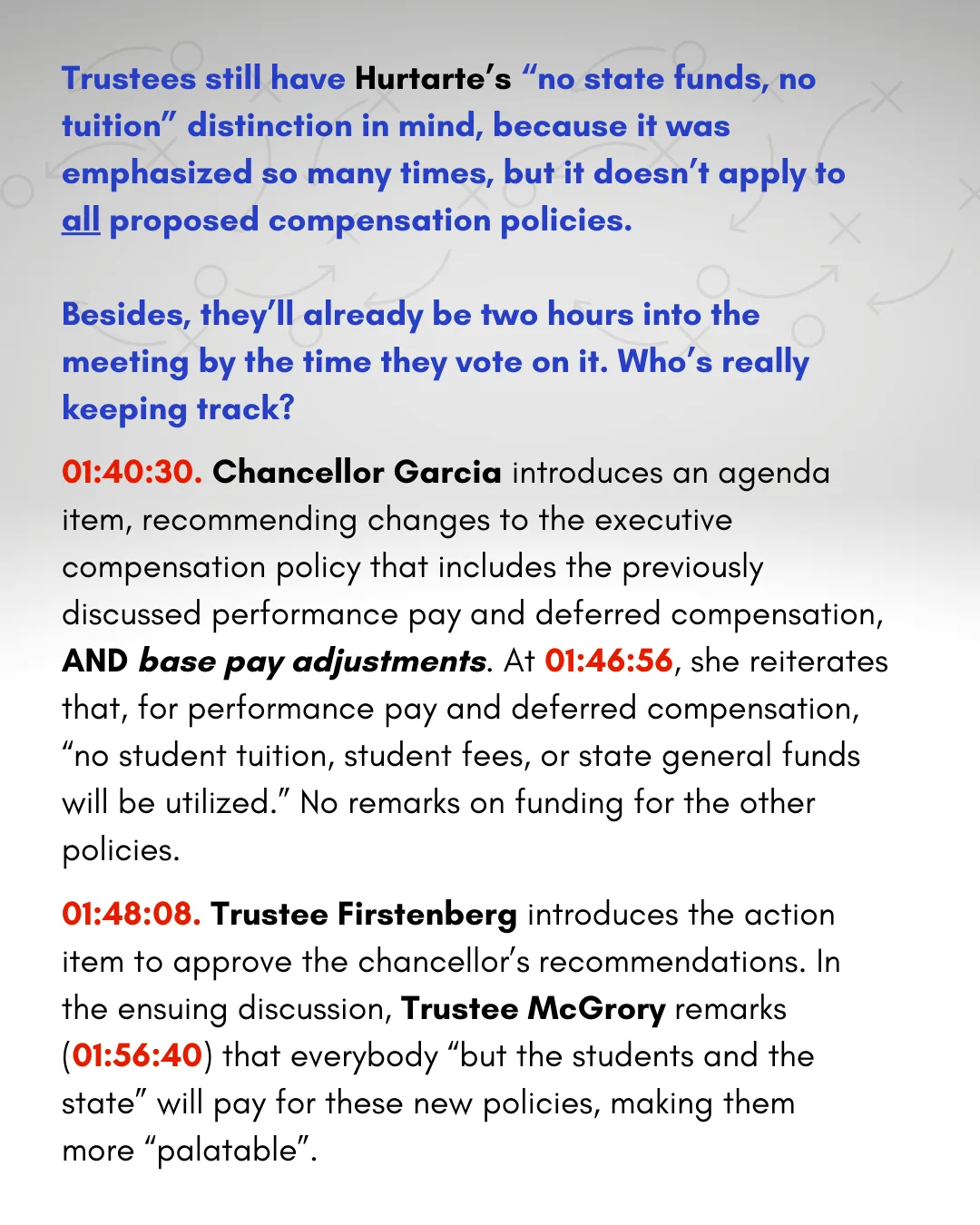 What happens next is key: Chancellor García proposed the recommended changes to the executive compensation policy that includes the discussed performance pay and deferred compensation, along with base pay adjustments. She then reiterated that the former two would be funded through “non-state, non-tuition, and non-student fee resources.” She repeated her claim: “This is critically important,” García said. “No student tuition, student fees, or state General Funds will be utilized.” This is intentional misdirection away from Trustee Arambula’s comment.