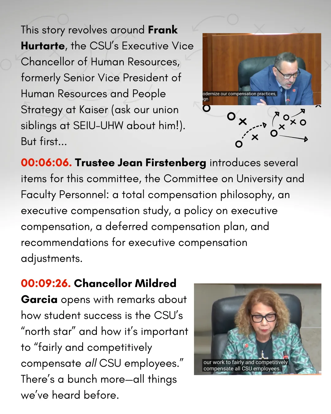 Hurtarte introduced the CSU’s Total Compensation Philosophy, which supposedly lays out a commitment to faculty, staff, and administrators by aligning pay and benefits with CSU’s mission and long-term goals. However, the discussion focused exclusively on an executive compensation study that included a policy on executive compensation, a deferred compensation plan, and recommendations for adjustments to their current compensation.