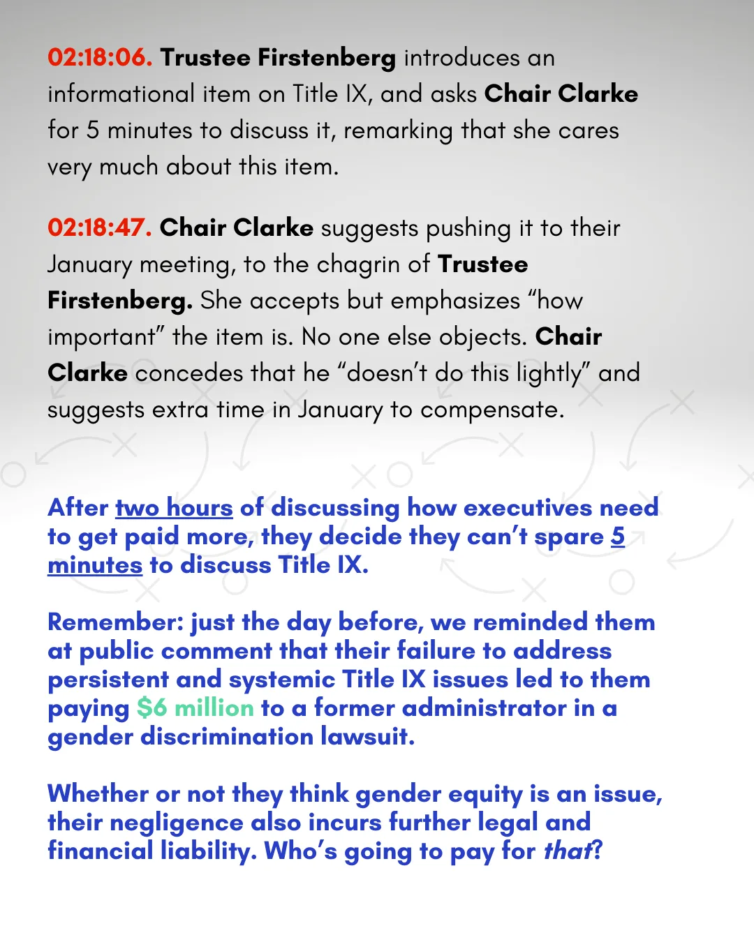 What makes all of this worse is the timing of these decisions. “Key compensation documents were released publicly at the last possible moment, and the [Board of Trustees] meeting schedule was shifted on the final day,” said Malladi, who offered public comment during the meeting. “This made it difficult for many employees and students to review the material or offer informed public comments. Meaningful participation requires predictable scheduling and adequate time to analyze these complex financial proposals.”
